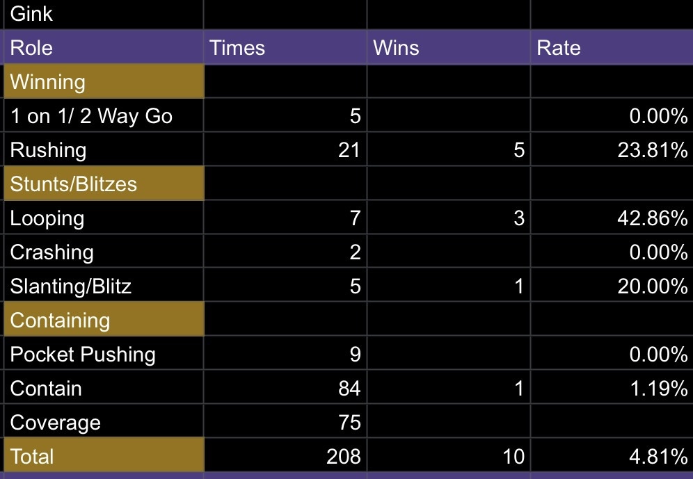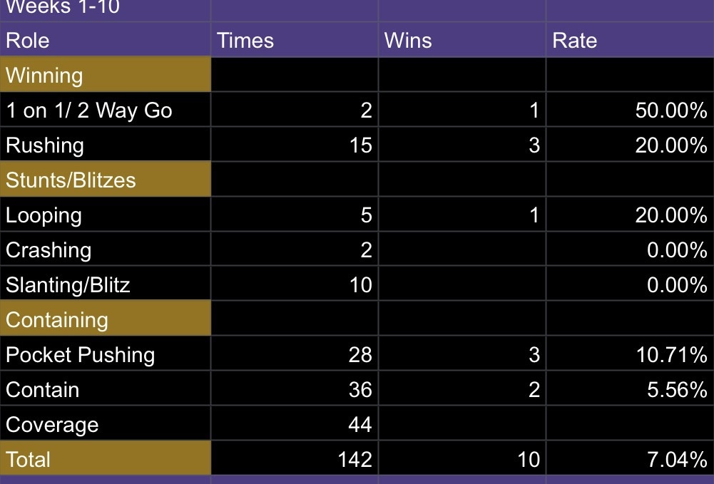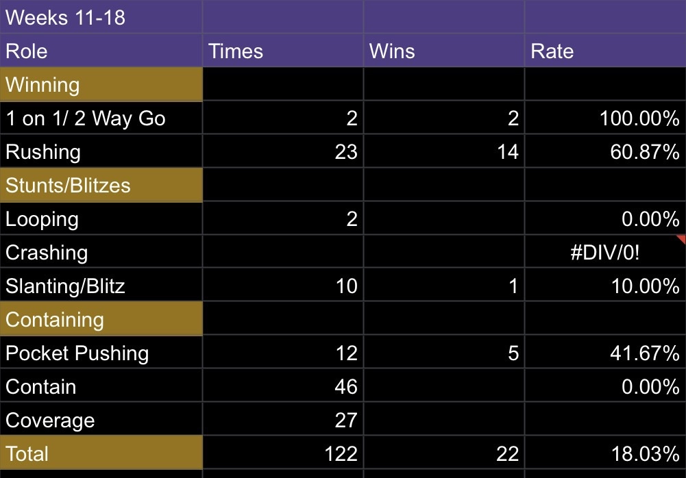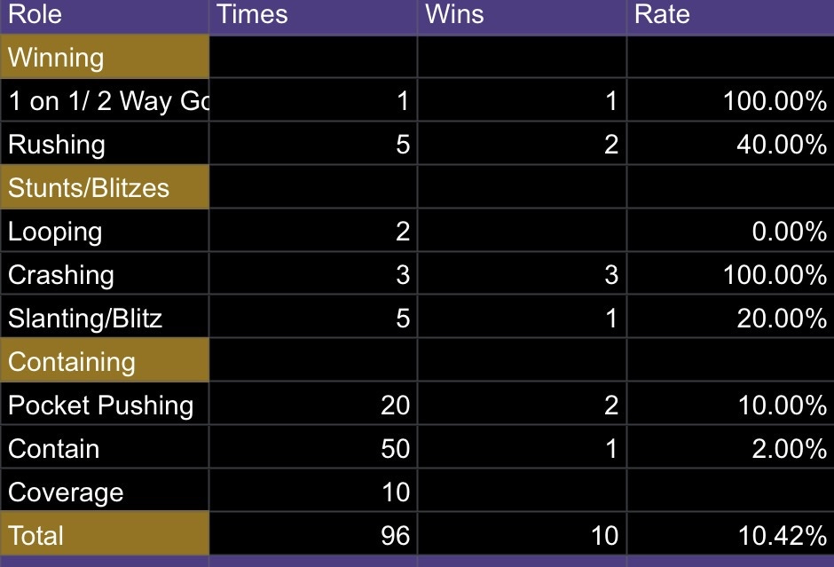 For the stats I charted, I separated each pass rush into different roles/intentions. Every pass rush is not the same, players will have different jobs on each play besides trying to win their rush. The roles are separated into different categories: Winning, Stunts, Containing.