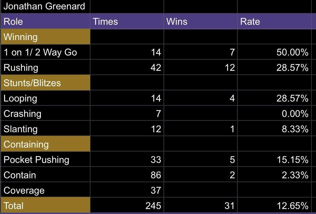 A solid season, the win rates were a bit lower than I expected. He did get double the rate of reps where he got to try to win a rush than AVG and Dallas when he was on the field. Greenard had a lot more up and down games, a majority of his wins came against KT Leveston, Nate Thomas, Joe Alt or an injured Taylor Decker. I do get the idea of trading him now… but just keep the good player. With the emergence of Dallas, they can make a legit duo.