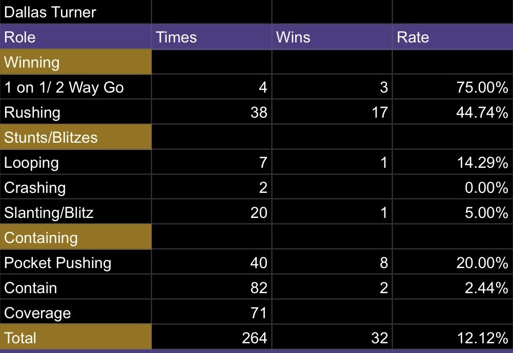 Oh yeah, ITS DALLAS TIME!!!! Great 2nd half of the season. This time he filled in for Greenard, but even then, he still was cooking when Greenard played in a few of those games. We can see the future in Dallas. He offers that Speed to Power element as well as being very fast. When Dallas won late, I would be more lenient to counting those reps as wins because he could still get to the QB in a timely manner. Anyways, Roll the Film
